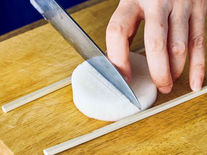 大根は幅2cmに切って皮をむく。まな板にのせて割り箸を上下に1本ずつ置き、2mm間隔で切り込みを入れる。切り込みが箸に対して垂直になるように裏返し、30~40度回転させて、同様に切り込みを入れる。ボールに塩小さじ1、水1と1/2カップを混ぜ、大根を浸して5分ほどおき、水けを絞る。
