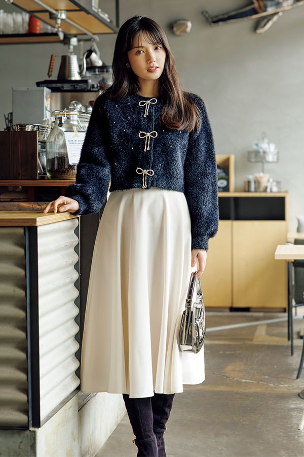 ニット¥11,990/WILLSELECTION(WILLSELECTION ルミネ有楽町店) スカート¥6,490/アストリア オディール(アストリア オディール ルミネエスト新宿店) イヤリング¥49,500/アビステ バッグ¥8,900/CHARLES & KEITH シューズ¥49,500/タラントン by ダイアナ(ダイアナ 銀座本店)