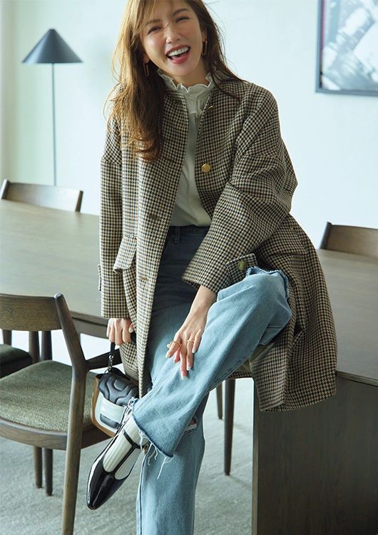 コート¥149,600/マッキントッシュ(マッキントッシュ ギンザシックス店) ブラウス¥26,400/マルティニーク(マルティニーク ルミネ横浜) デニムパンツ¥19,800/アルページュストーリー ピアス¥3,850、リング[人さし指]¥3,080/ともにヘンカ、リング[薬指]¥9,900/タラッタ(以上ロードス) 靴下¥1,045/靴下屋(タビオ) バッグ¥172,700/ピエール アルディ(ピエール アルディ 東京) パンプス¥17,050/ダイアナ(ダイアナ 銀座本店)