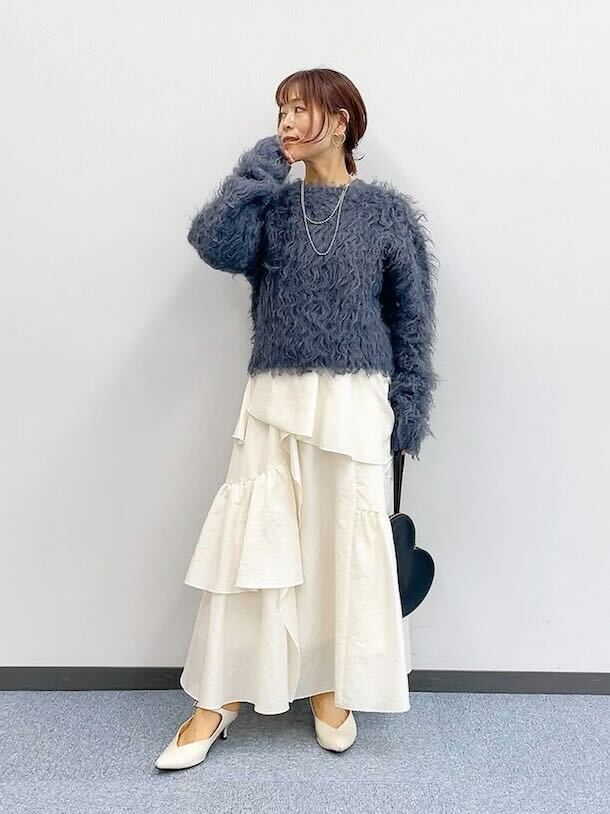 華やかシャギーニットに大きなフリルの白スカートが大人可愛いコーデ。グレーチョイスが落ち着いた印象をプラスします。毛足が長いニットはこの時期一つは欲しいトレンドアイテム。絶妙な丈感が低身長さんのロングスカートコーデもバランスよく整えます。ふわふわ素材の一点投入でパッと着映えするスタイルです。