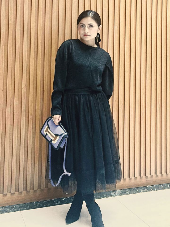 煌めくラメ感が上品なトップスを使ったブラックコーデ。カーディガンはシンプルな形なのでちょっとした羽織りとしても使える便利アイテムです。冬のオシャレをラメとチュールで華やかにスタイルアップ。