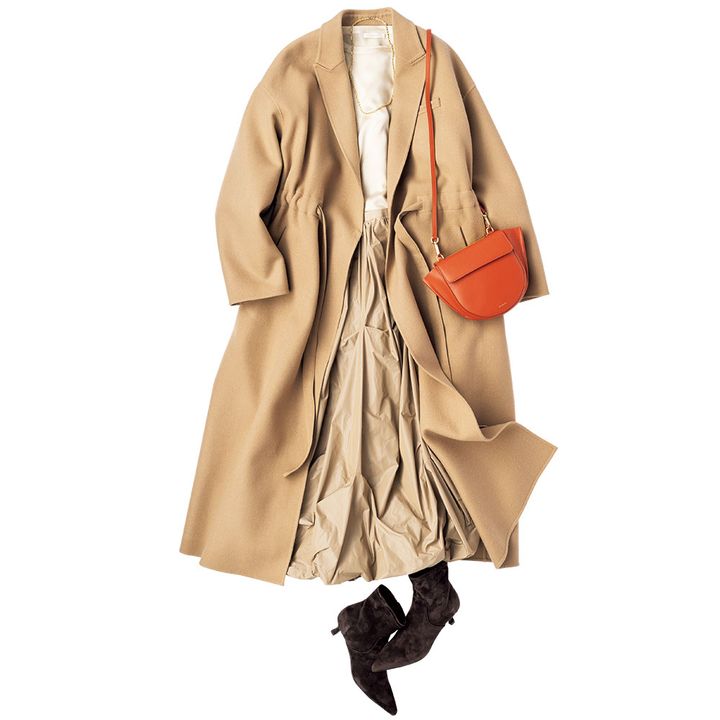 キャメル×テラコッタの同系色のグラデーションで馴染みつつ差し色にも。フェミニンなラインに合う丸型Bagが新鮮。コンテンポラリーなデザインが魅力の〝ワンドラー〟。秋も夏も合う絶妙なテラコッタがキャメルコートと好相性。