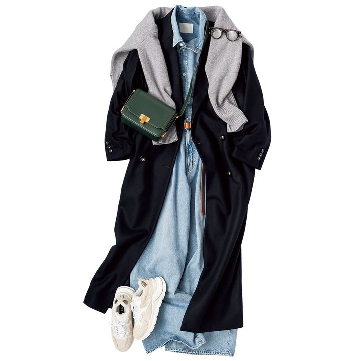 バッグ[H16×W20×D6cm]¥183,700(スーザン サツマリー/メゾン・ディセット)コート¥121,000(サクラ/インターリブ)シャツ¥41,800(シチズンズ・オブ・ヒューマニティ)デニムパンツ¥18,700(ニードバイ ヘリテージ/ゲストリスト)ニット¥30,800(ADAWAS/ショールーム セッション)スニーカー¥40,700(デイト/ティースクエア プレスルーム)ベルト¥12,100(レフィエ/フラッパーズ)メガネ¥42,900(アイヴァン/アイヴァン 東京ギャラリー)