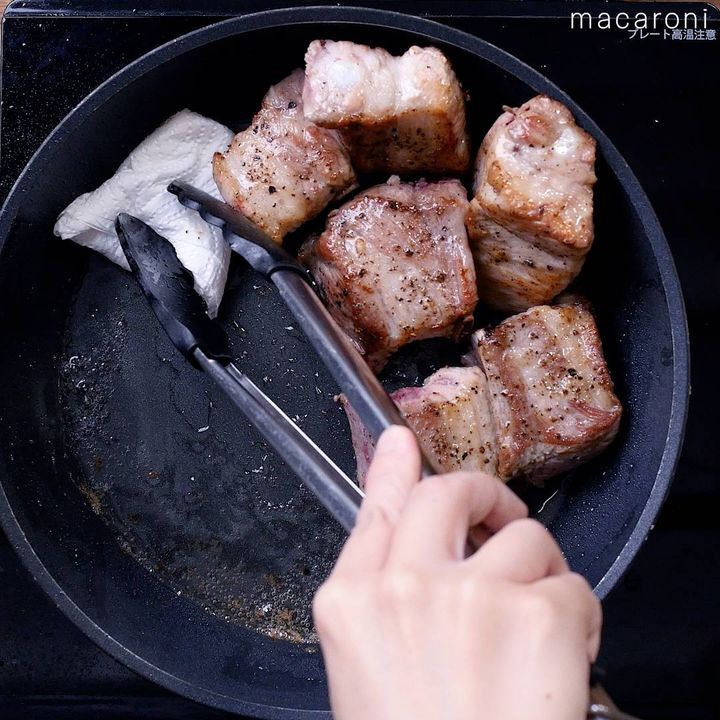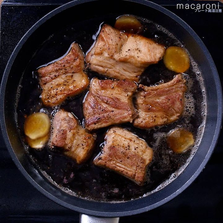 3: 全面に焼き色がついたら余分な油をペーパータオルで拭き取ります。【煮汁】を加えます。