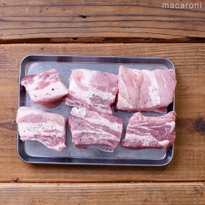 1: スペアリブに塩、黒こしょうで下味をつけます。
