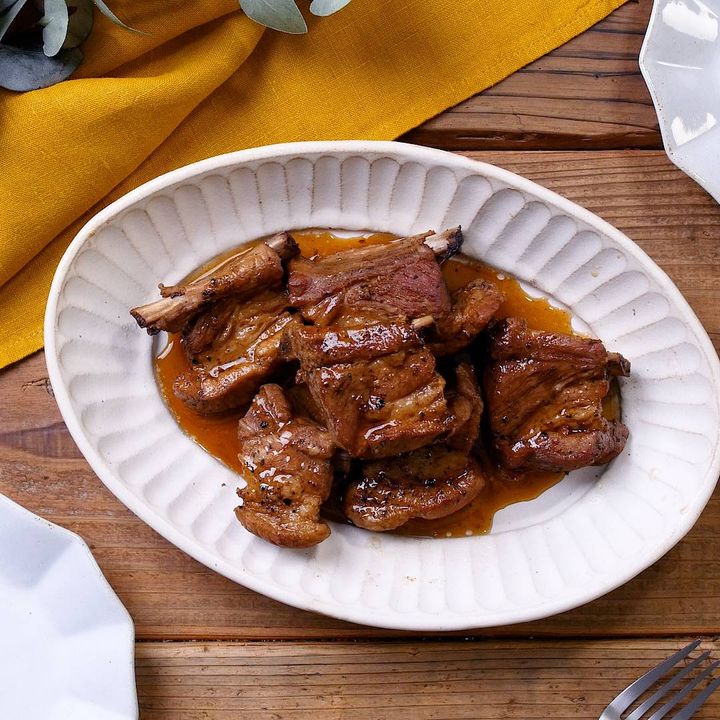 5: スペアリブを取りだし、中火にして煮汁にとろみがつくまで煮詰めます。器に盛り付け、煮汁をかけて完成です。