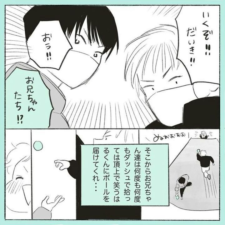 はるくんが落とした2つのボールを何度も何度も取って来てくれた2人の小学生のお兄ちゃん。楽しくなったはるくんは、何度も何度もボールを落とし、そのつどヘトヘトになるまで付き合ってくれたとのこと。本当に優しいお兄ちゃんたちですよね。