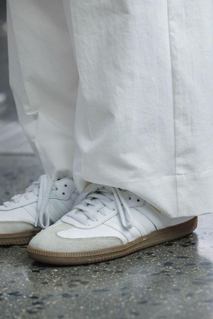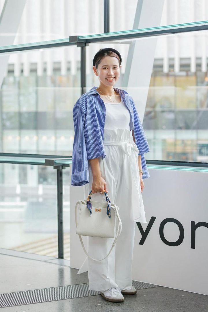 「国内外問わず、素敵な人がインスタグラムでサンバのコーディネートをアップしているのを見て欲しくなり、1月に購入しました。オールホワイトのサンバは主張しすぎないので、手持ちの服に合わせやすく、パンツ、スカート、どちらのコーディネートにも合うのがうれしいんです。秋冬はショートパンツと靴下を合わせて、夏とは違った合わせ方を楽しむ予定です」橋本礼子さん・160㎝(会社員/7歳の男の子ママ)