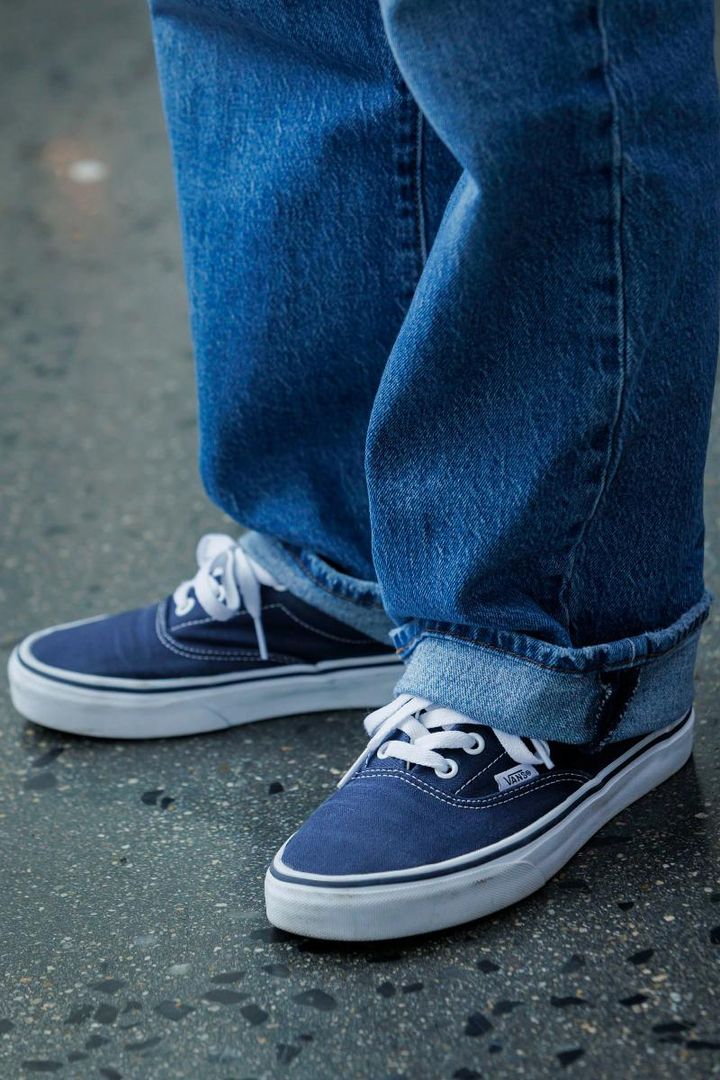 「実はカジュアルファッションも好きなので、スニーカーは欠かせないアイテム。特にスニーカーブランドのアイテムは値段も控えめなので、ネイビーや赤・グリーンなど、カラーを取り入れるのに最適です。VANSのオーセンティックは王道のカジュアル感が逆に新鮮に感じて、春に買って以降大活躍。デニムの裾はひと折りして抜け感を出します」高橋誉子さん・158㎝(yoriデザイナー/13歳と2歳の男の子と11歳の女の子ママ)