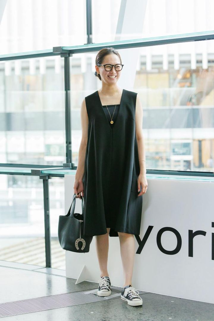 「オールスターは昔から好きで5〜6足はリピートしている、私にとってスタンダードなスニーカー。スッと足入れがよく、スリッポン感覚で履ける気軽さが最高! シンプルなワンピに合わせて、韓国で買ってきてもらったパール紐でアレンジ。なかなかのインパクトですが、見た人には“どこで買ったの?”と聞かれて、話題性抜群です」平井由利子さん・169㎝(MYINEディレクター/11歳の男の子と6歳の女の子ママ)