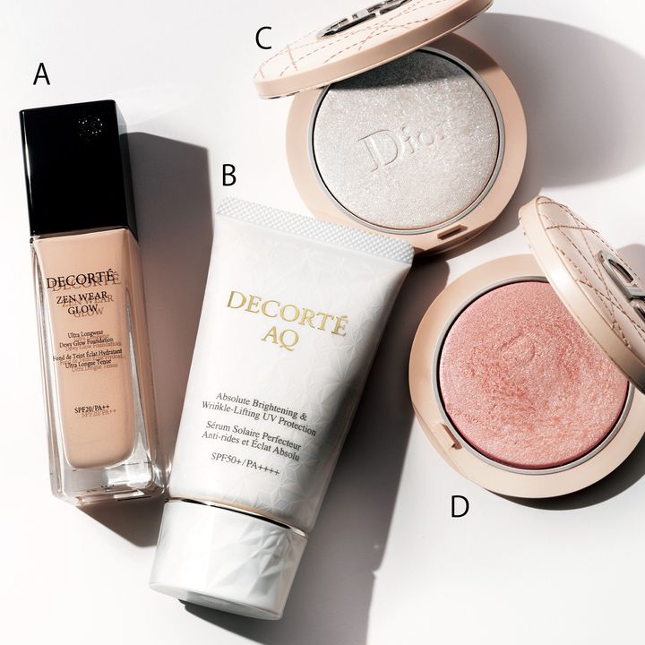 ポイント1:美白効果もある淡いピンク色のBの下地を顔全体に薄く塗り、頰の高い部分は焼けやすいので重ねづけ。