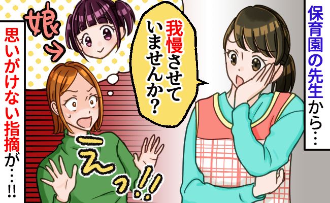 ある日、園の先生から娘のことについて「ちょっと我慢しているように感じます」と言われました。思いもよらない言葉にびっくり。ですが、娘のふるまいや私の言動を振り返ると、思い当たる節があり……。