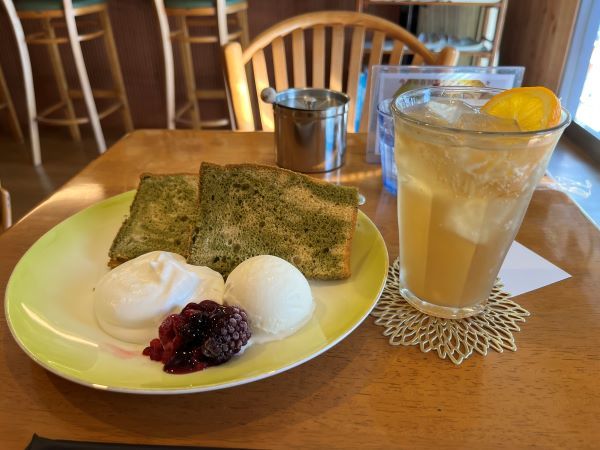 シフォンケーキは抹茶の味がしっかりとしていてとっても美味しい! ふわっふわです。添えてある生クリームやアイスクリームとの相性も良くかなりのスピードで食べてしまいました。美味しい! ドリンクは生姜スカッシュ。コーヒーが美味しいのだろうと思ったのですが、初めて見たメニュー名に飛びついてしまいました。ドリンクの中には生姜の刻んだものが入っていて、とても美味しかったです!