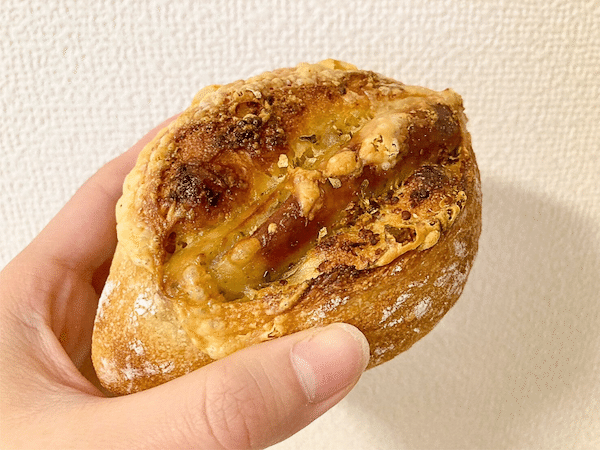ふんわりもちもちの生地と、外側の適度なハード感のバランスが最高!散りばめられたくるみのカリッとした食感と香ばしさが、チーズの風味を引き立てています。