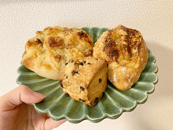今回選んだのは、「レモン&パセリのソーセージフランス(300円)」と「ゴルゴンゾーラとくるみとはちみつのフォカッチャ(340円)」、「チョコスコーン(260円)」の3点です。
