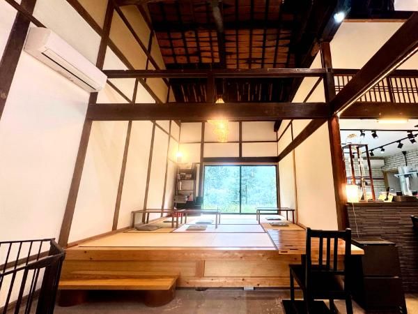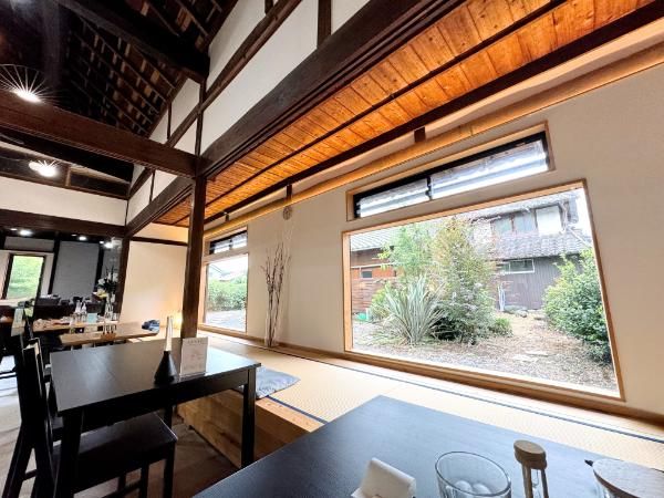 店内にはテーブル席と座敷席があり、大きな窓が設けられています。テーブル席は片側に畳が敷かれていて、庭を眺めながらゆっくりと過ごすことができます。