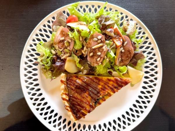 キッシュは「ベーコン」と「野菜」の2種類があります。「野菜」のキッシュは、かぼちゃとパプリカが入っていて優しい味でしたが、掛かっているソースと一緒にいただくとコクが深くなり、食べ応えがありました。