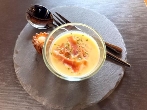前菜のカヌレ・サレは、塩気のあるカヌレです。外側はカリッと、中はトロッとしていて、上に乗ったクリームチーズとの組み合わせが素晴らしい。サツマイモとココナッツミルクを使った甘いスープには、塩気のあるスペイン産生ハムがトッピングされており、後を引く美味しさでした。
