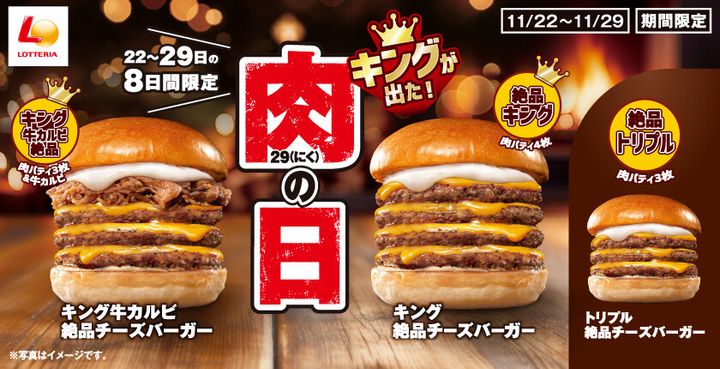 ロッテリアは、11月22日(金)から11月29日(金)までの8日間限定で、牛肉たっぷりなキングサイズのバーガーを楽しめる「ロッテリア 肉(29)の日」を開催中!「キング牛カルビ 絶品チーズバーガー」や「キング 絶品チーズバーガー」などが食べられますよ。