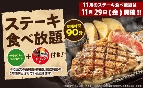 ステーキガストでは肉の日限定で、定番ステーキから希少部位に至るまで90分の食べ放題ができます! お腹いっぱいお肉を堪能できますよ♪