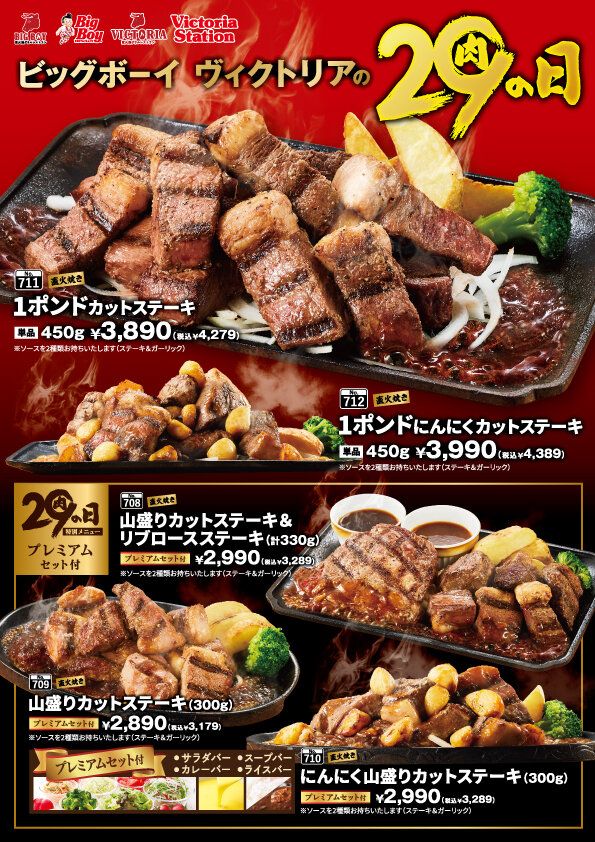 ビッグボーイでは、"いい肉の日"(11月29日)にちなみ、11月25日(月)~30日(土)の6日間限定で「肉の日」を開催中。ビッグボーイ厳選の切り落とし牛肉を使用したカットステーキや、450gが楽しめる「1ポンドカットステーキ」などボリューム満点の商品が食べられますよ。