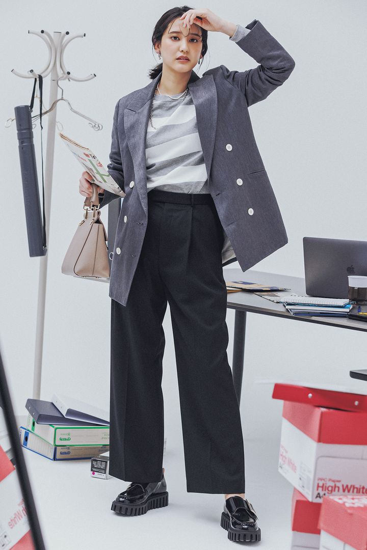タック入りのワイドなシルエットが、オフィカジに旬な存在感をプラス。ジャケットをいい意味でラフにくずすバランサー。パンツ¥53,900(エイトン/エイトン青山)ボーダーカットソー¥16,500(ウィム ガゼット/ウィム ガゼット ルミネ新宿店)ジャケット¥97,900(カオス/カオス丸の内)バッグ¥383,900ローファー¥160,600(ともにロジェ ヴィヴィエ/ロジェ・ヴィヴィエ・ジャパン)ピアス¥35,200ネックレス¥77,000パールネックレス¥47,300ブレスレット¥39,600(すべてマリハ)