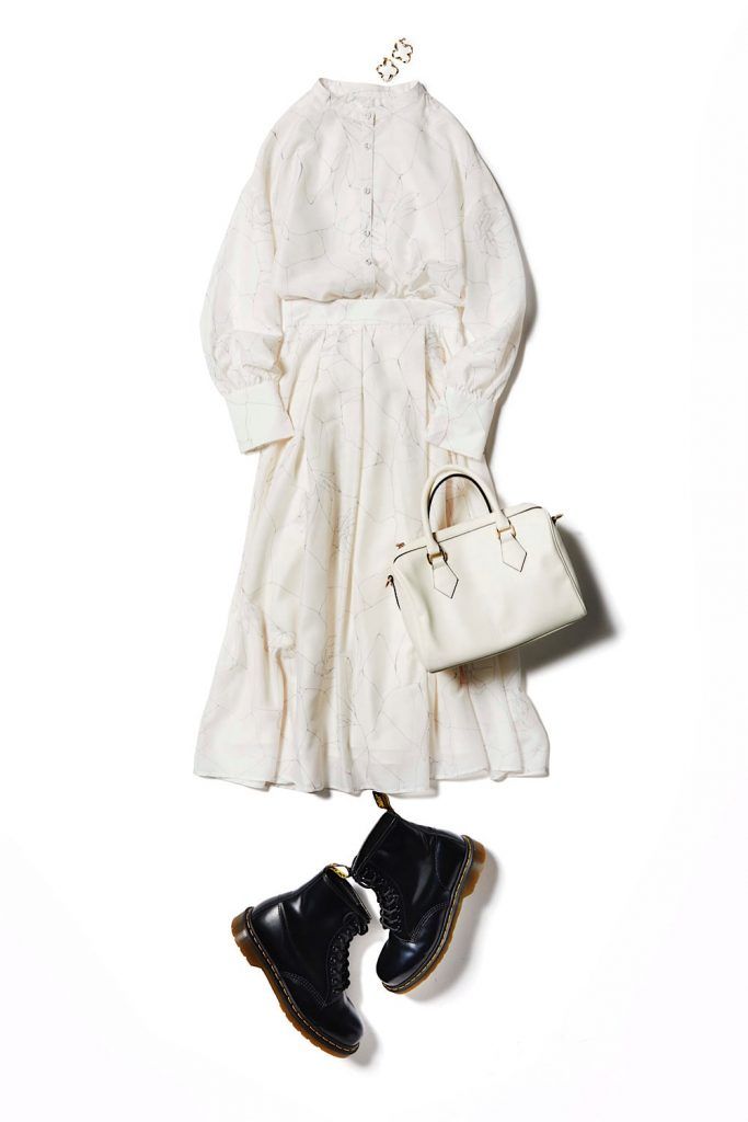 「8ホールブーツ」はレースアップなので、王道キレイめコーデとの相性も抜群。白のバンドカラーシャツとフレアスカートのワンピース風スタイルに、辛口なマーチンを合わせてコーデの甘さを軽減します。オールホワイトの中にあえて黒を投入して引き締めることで、ワントーン特有の“のっぺり感”も解消。ブーツ※同じ シャツブラウス¥5,489スカート¥6,589(クチュール ブローチ/ワールド プレスインフォメーション)イヤリング¥14,300(アンテプリマ/アンテプリマ 新宿高島屋)バッグ¥13,200(RANDEBOO)