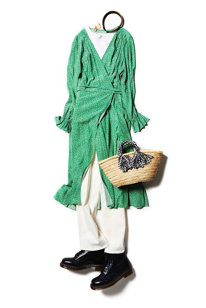 足元の黒に負けない、存在感のあるグリーンワンピースを効かせた夏らしいコーデ。インナーとパンツをクリーンな白に統一すれば、バランスよく爽やかにまとまります。マーチンを合わせるパンツは、ストレートで下にストンと落ちるものを選ぶのがコツ。ラフさが残る今っぽいレイヤードで、気張らないデートスタイルに。ブーツ¥26,400〈ヒール=3cm〉(ドクターマーチン/ドクターマーチン・エアウエア ジャパン)カシュクールワンピ¥16,500(AMAIL)タンクトップ¥5,500(AKTE)デニム¥18,000(ノーク バイ ザ ライン/ノーク)カチューシャ¥1,540(アネモネ/サンポークリエイト)イヤリング¥1,870(GOLDY)カゴバッグ¥7,480(ファティマ モロッコ/ファティマ)
