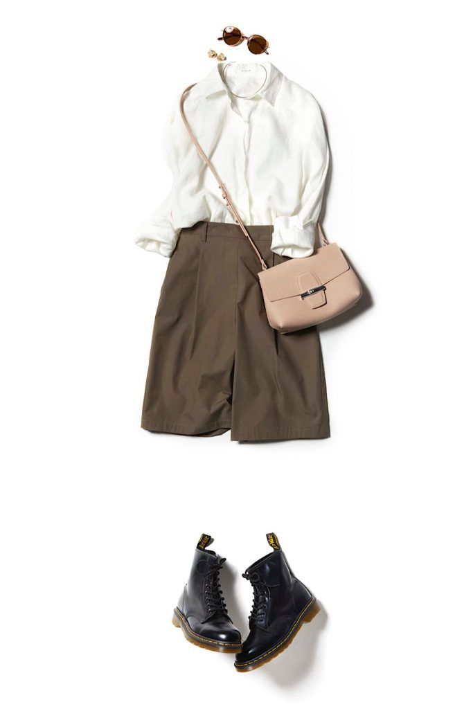 大人でも着やすいひざ丈ボトムスは、ほどよくボリューミぃなキュロットをセレクト。横に広がりすぎない幅で脚の細見えを叶えつつ、ショートブーツとの丈バランスで、さらに脚長効果を強調します。トップスはハンサムな白シャツでシンプルにまとめるのが◎。差し色として投入するくすみピンクのバッグが、女性らしさを添えます。ブーツ※同じ シャツ¥20,900ハーフパンツ¥16,500(ルーニィ)サングラス¥42,900(アイヴァン/アイヴァン 東京ギャラリー)イヤリング¥1,980(アネモネ/サンポークリエイト)チョーカー¥22,000(e.m./e.m.表参道店)バッグ¥62,700(ロンシャン/ロンシャン・ジャパン)