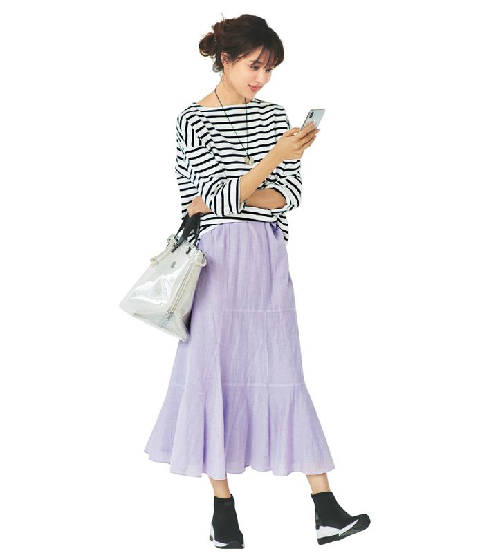 ボーダー×キレイ色スカートの鉄板スタイルがソックススニーカーでさらにあか抜け【今日のコーデ|着回しDiary】