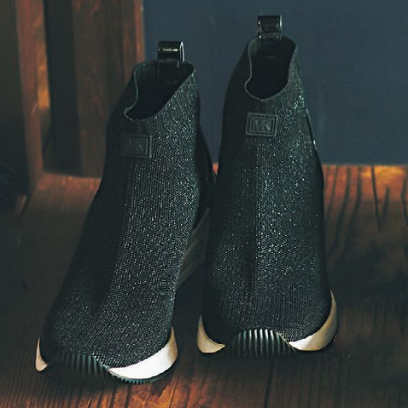ソックススニーカーはブーティ感覚で使えるから、女っぽいコーデとも好相性。¥27,000(マイケル マイケル・コース/マイケル・コース カスタマーサービス)