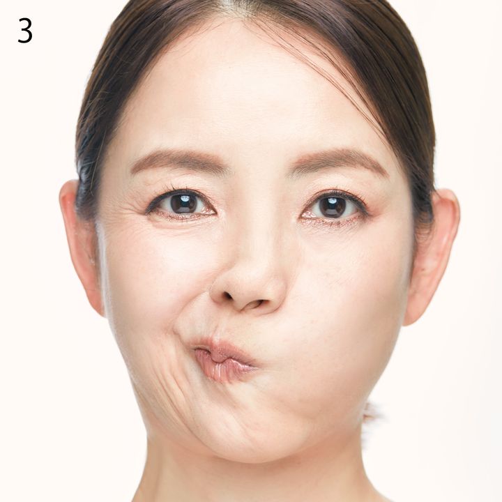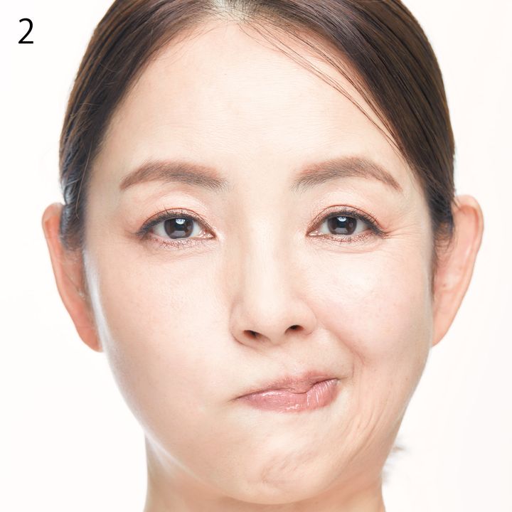 3. 1の状態に戻してから、同様に口角を右上に引き上げる。速さは意識せずジワジワ行うのがポイント。交互に5セット。