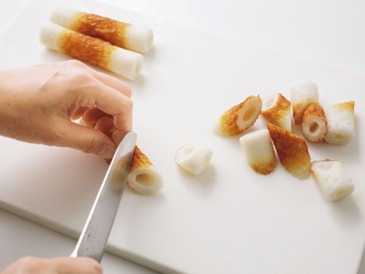 (1)ちくわは小さめの乱切りにする。万能ねぎは長さ4cmに切る。卵は割りほぐし、塩小さじ1/4、こしょう少々を加えて混ぜる。