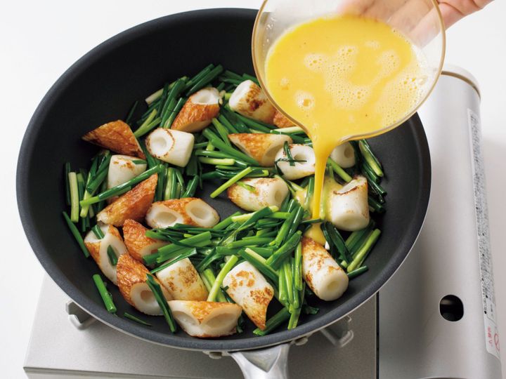 (2)フライパンにサラダ油大さじ1/2を中火で熱し、ちくわを入れて1分炒める。万能ねぎを加えて2分炒め、(1)の卵液を回し入れる。全体を大きく2~3回混ぜて火を止める。