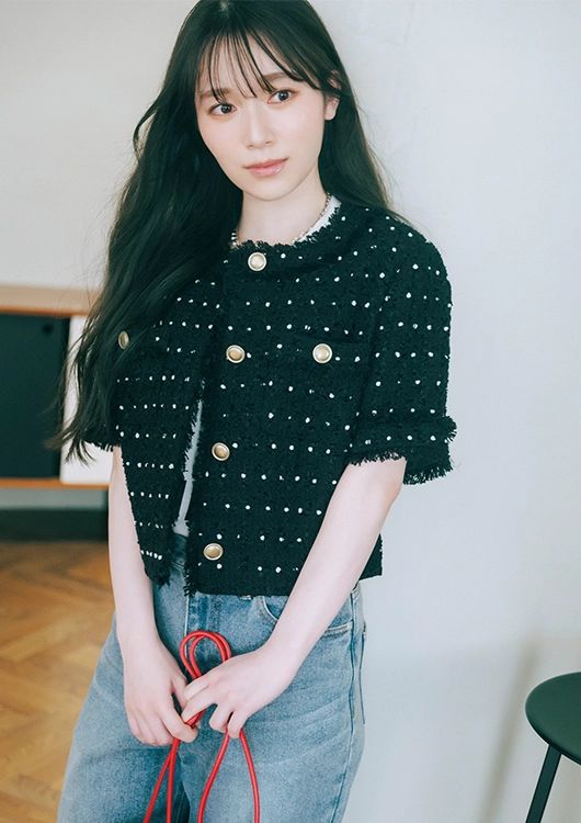 ドット織りツイードが珍しく、首まわりすっきりのノーカラーに対して、ほんのりパフ袖のアンバランスがレトロになりすぎず今っぽい。デニムを合わせてカジュアルに落とし込んで。