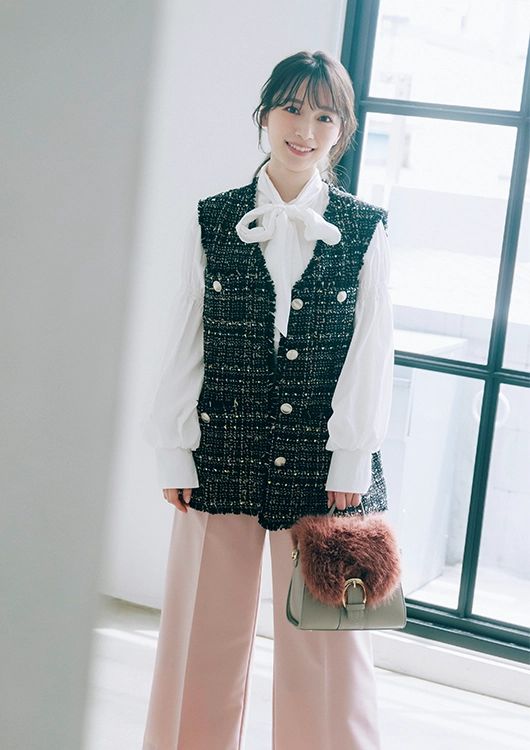 ツィードジレ[共布ベルト付き]¥18,920/LILY BROWN(LILY BROWN ルミネエスト新宿店) ボウタイブラウス¥11,000/31 Sons de mode(ヒロタ) バッグ¥17,600/ダイアナ(ダイアナ 銀座本店) パンツ[ブラウス付き]¥17,050/COHINA