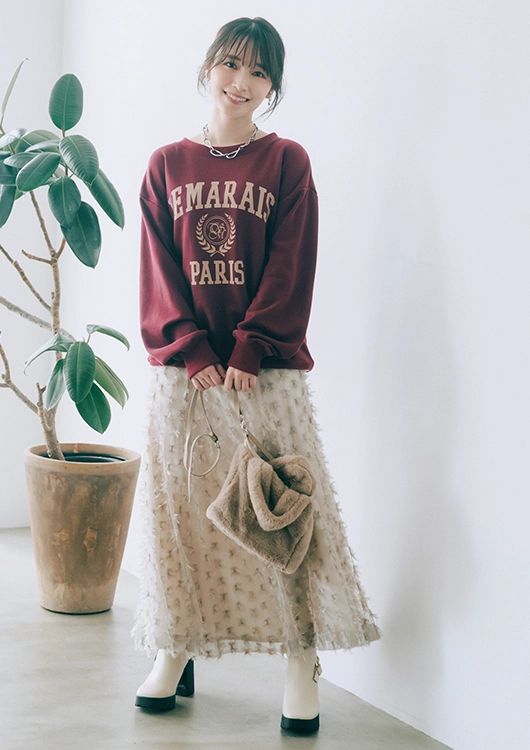 ロゴスウェット¥9,790、バッグ¥9,900/ともに31 Sons de mode(ヒロタ) チュールフレアスカート¥19,800/SNIDEL ルミネ新宿2店 ネックレス¥26,400/アデル ビジュー(アデルビジュー ショールーム) イヤカフ¥4,950/ロニ ブーツ¥31,350/ダイアナ(ダイアナ 銀座本店)