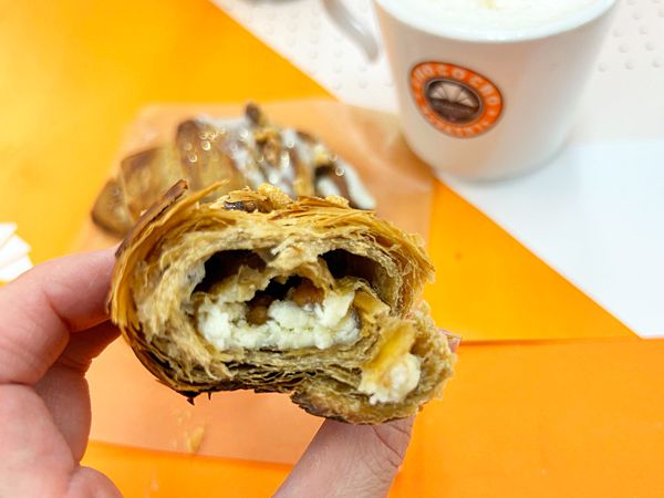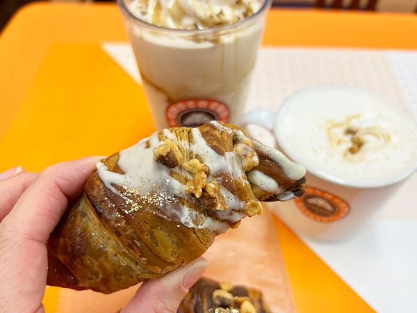 ブラウンシュガーを練り込んだ生地に、ホワイトチョコレート、くるみ、メープルソースを一緒に包み込み焼き上げたチョコクロ。ホワイトチョコレートの甘さはもちろん、くるみのザクザク食感と香ばしさに加えて、芳醇なメープルソースの香りが重なり合って、贅沢な味わい。