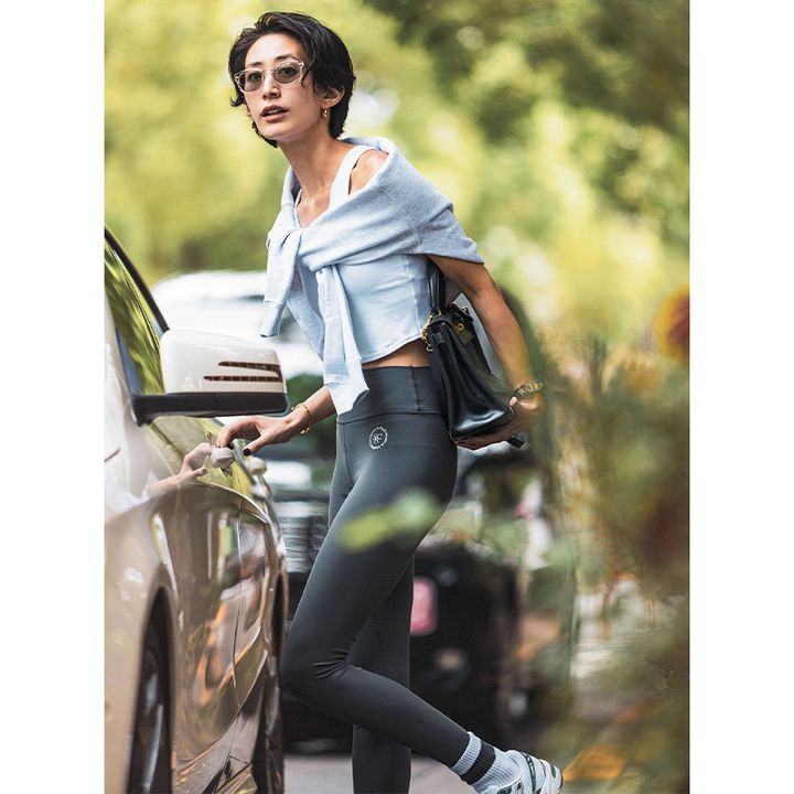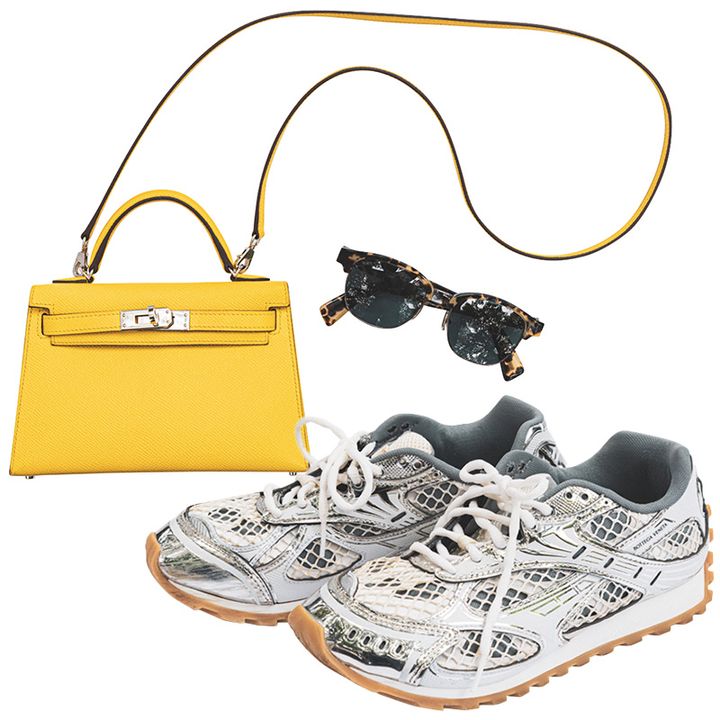 レギンスだけだと、どうしても“運動着感”が払拭できないので、ブランド小物できちんと感をプラスします。エルメスのミニサイズの「ケリー」はイエローを選んで差し色に。すっぴん隠しに欠かせないサングラスはTOD’S、ヘビロテ中のシルバースニーカーはボッテガ・ヴェネタ。
