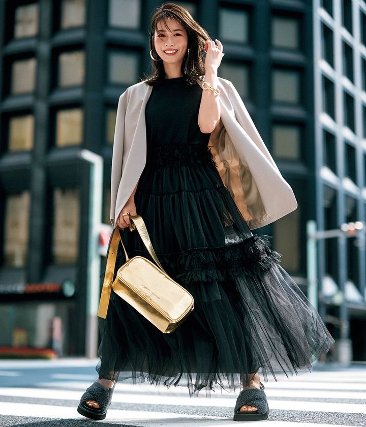 ジャケット¥55,000(ウィム ガゼット/ウィム ガゼット 青山店)ワンピース¥27,500(THIRD MAGAZINE)チュールスカート¥24,200(メゾンスペシャル/メゾンスペシャル 青山店)バッグ¥9,900(アダム エ ロペ)サンダル¥53,900(サクラ/インターリブ)ピアス¥15,400ブレスレット¥26,400(ともにワンエーアールバイウノアエレ/ウノアエレ ジャパン)2本リング¥21,230(ソコ/ZUTTOHOLIC)