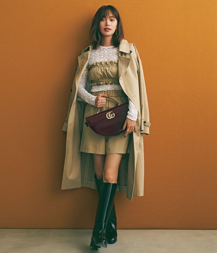 レーストップス×ビスチェにショーパン。トレンドをたっぷり盛っても浮つくことなく大人に決まるのは端正なトレンチコートのおかげ。レイヤードを楽しめる冬こそ甘辛コーデのバリエを広げるチャンスに。