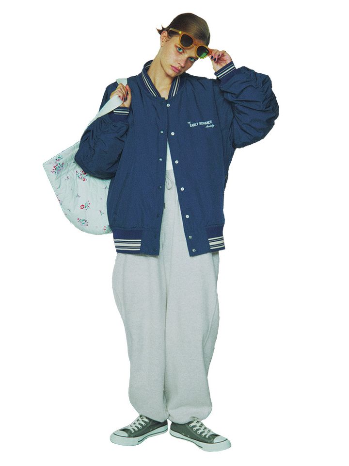 ハリのあるオックス生地で、きちんと感が残るネイビーブルゾン。架空のクラブのチームジャケットをイメージした、胸元の刺しゅうやラインデザインがラフな装いの飾りとして生きてくる。軽くてあたたかい中綿入り、かつヒップが隠れるオーバーサイズでコートがわりとしても活躍。