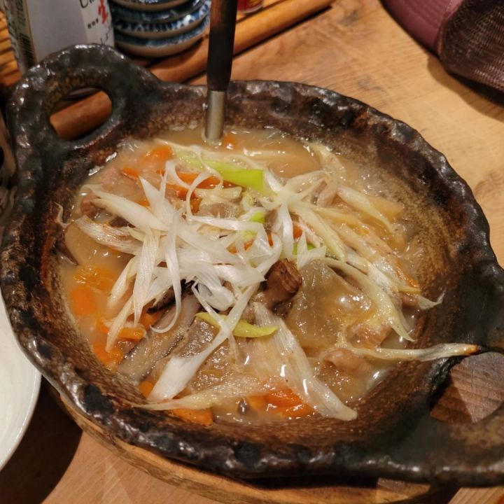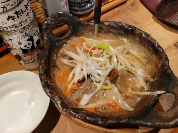 それとモツ煮込み。思ったより量が多くて、ありがたかったです。とても熱くて、モツも野菜もしっかり煮込まれていて、満足感がありました。