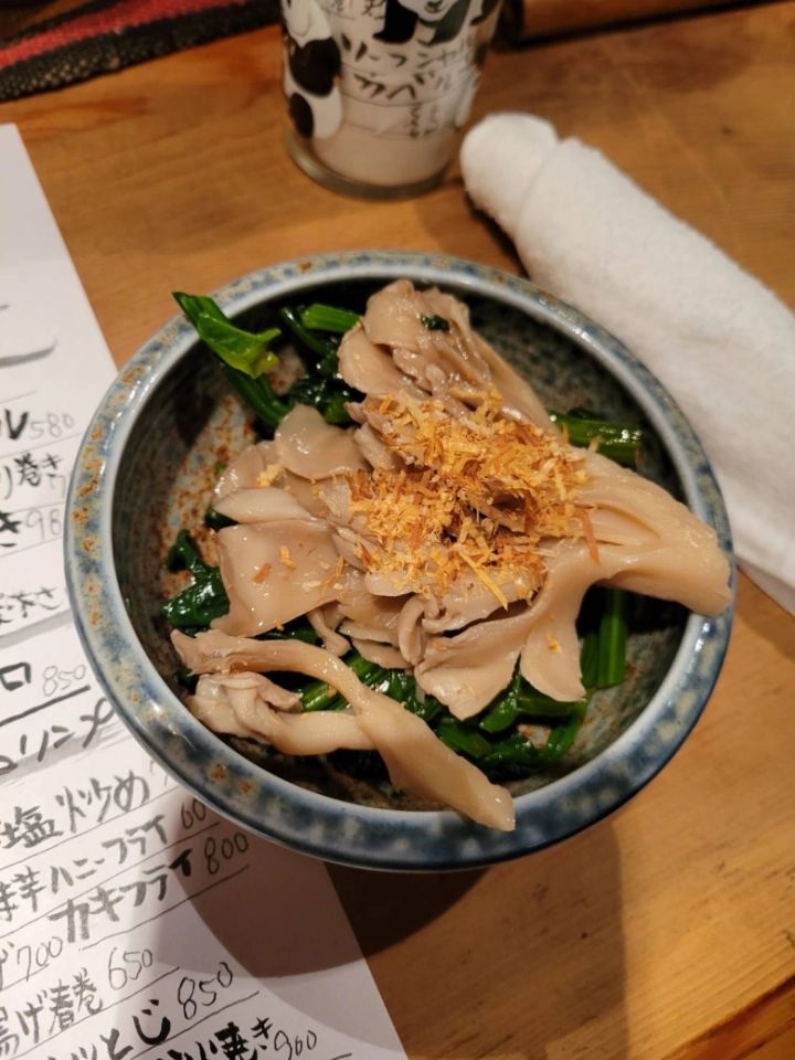 チヂミほうれん草と舞茸のおひたし。出汁が効いた、懐かしい味でした。