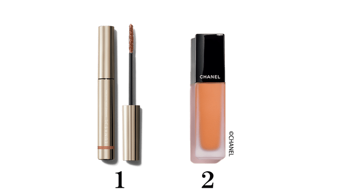 1. マホガニーブラウン×ゴールドパールのマスカラ。ぽてっと液がのらないので洗練された印象に。