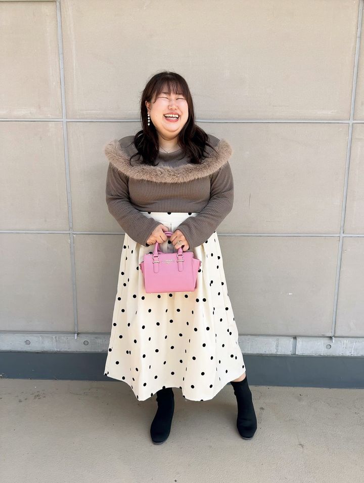 美術館巡りコーデに挑戦! 肩幅が広いので、ファーケープニットで目線を落とし、フレアスカートでウエストマークを意識してみました。パールアクセサリーで華やかにし、ピンクのバッグを差し色にしました。