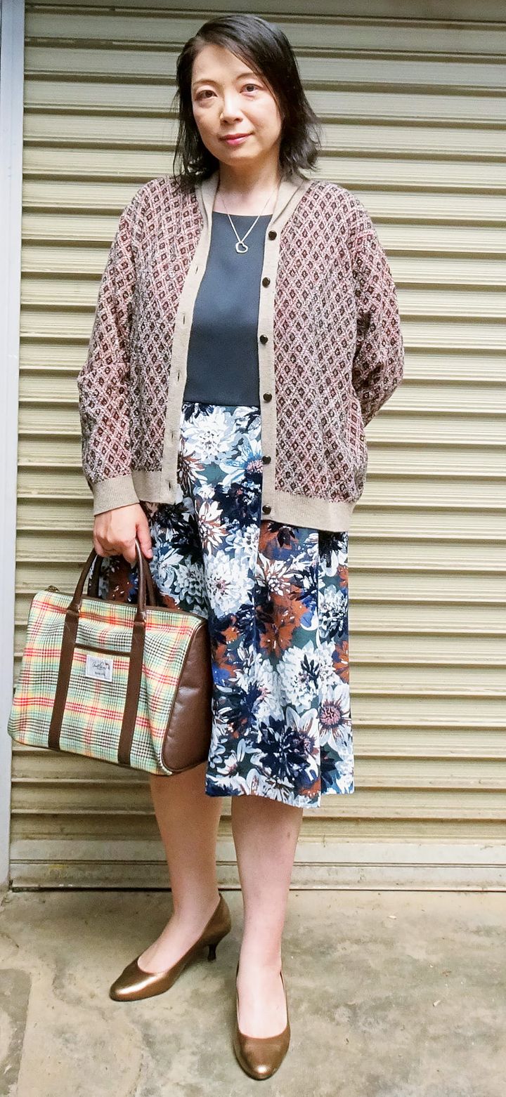 スカート部分の大きな花柄が目を惹くワンピースに襟付きのカーディガンを羽織って、秋を感じさせる着こなしに。バッグもあえてチェック柄を選んで、華やかな柄同士のコーディネートを楽しみました。