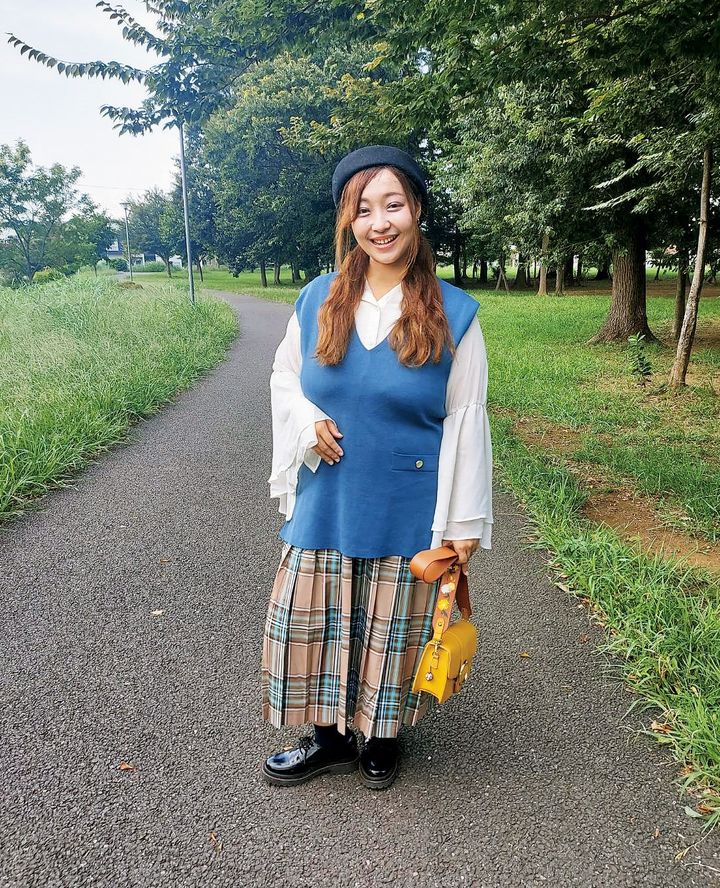 チェック柄スカートをメインに全体をコーディネートしました。ベストはチェック柄のブルーを選んだことでカラフルになり過ぎず、まとまりある着こなしに。プレッピーに甘さを足すため、袖にスリットが入ったブラウスを合わせました。