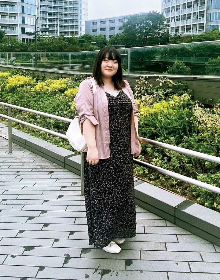 ブラックのワンピースに、くすみピンクのサテンブラウスを合わせて、フェミニンになり過ぎないデイリースタイルに。パンプスとバッグ、インナーをホワイトでそろえることで、ブラック・ピンク・ホワイトの3色コーデにまとめました。