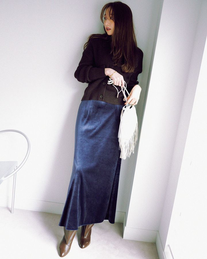 ストンと落ち感のあるロングスカートは、重たくなりがちなベロア素材でももたつかずにスタイルアップが叶い、ぴったりフィットしすぎる訳でもないから、体のラインも気になりません。
